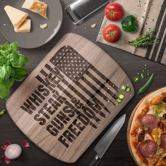 Handcrafted Wooden Cutting Board - Whiskey Steak Guns & Freedom | Walnut & Maple